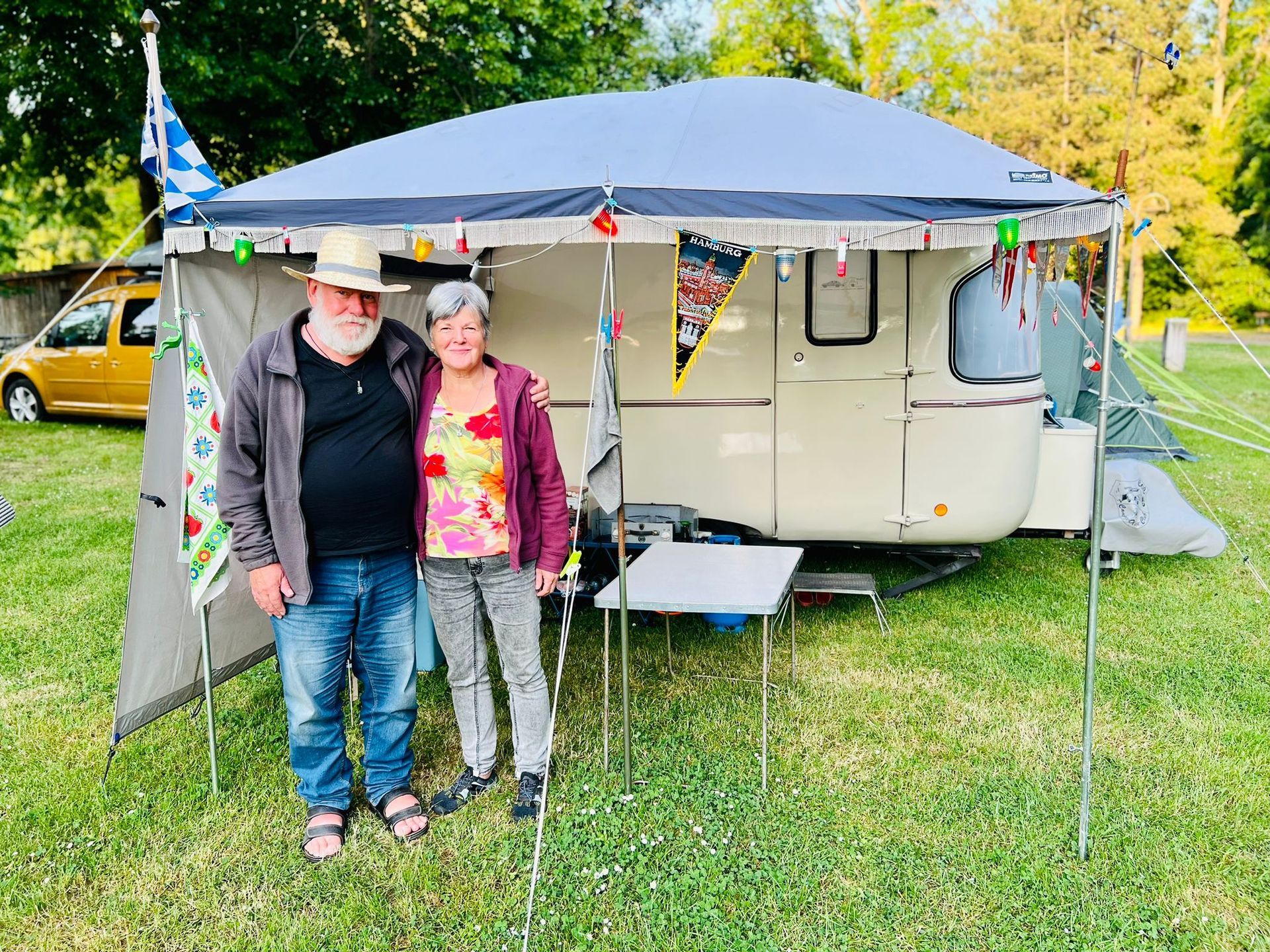Sonntag, 28.5.: Nach einem ausgiebigen langen sonnigen Frühstück an der Tafel, beschließe ich, einen Flohmarkt mit unseren alten Schätzchen zu veranstalten. Wir haben ja schon vor unserer Fahrt einen Käufer für unseren Wohnwagen gefunden, und in die Oldie-Klappräder hat sich Oliver verguckt. Alles geht ruck zuck in liebevolle Hände und wir sind froh so nette Besitzer für unsere alten Teile gefunden zu haben.