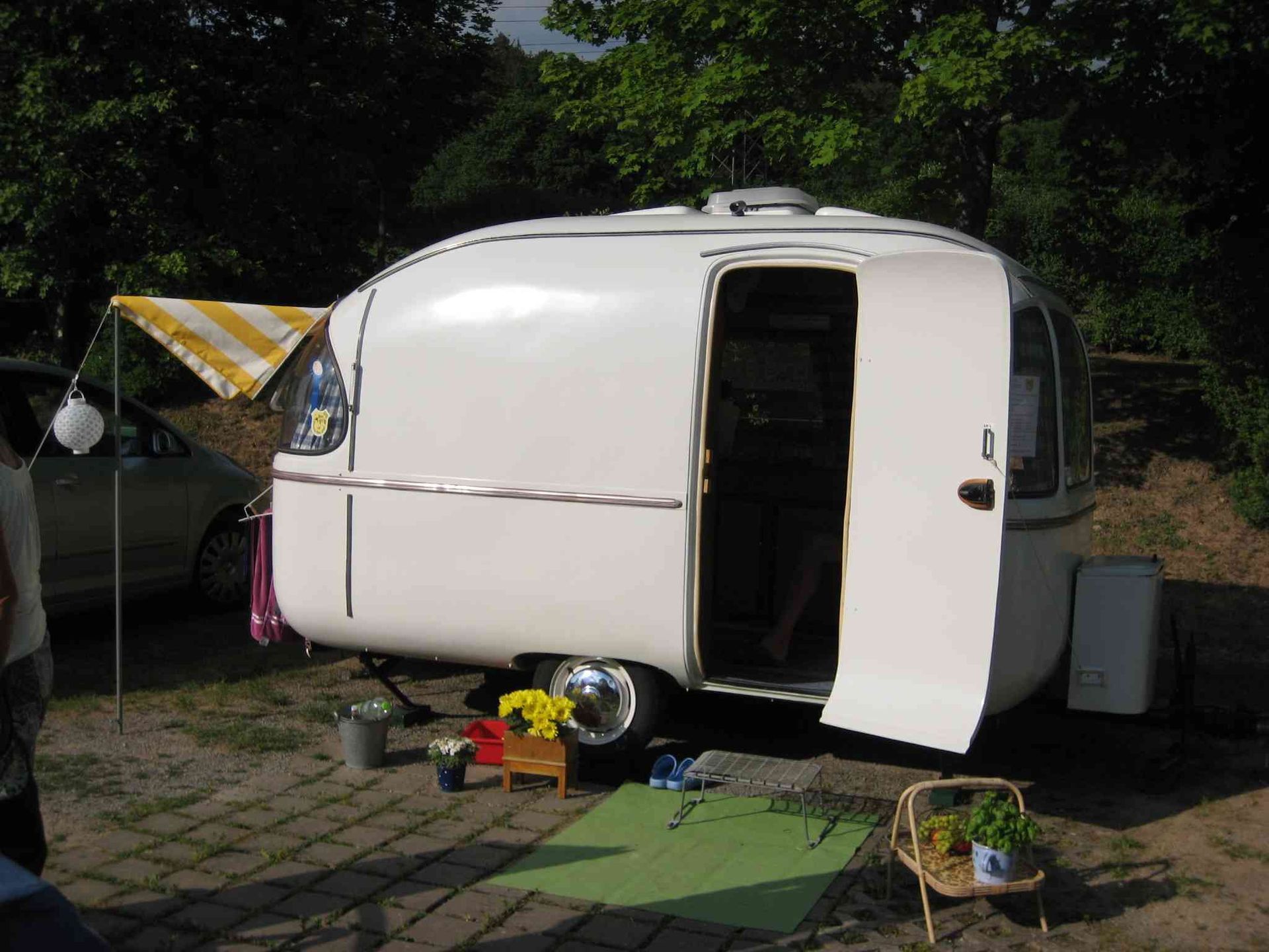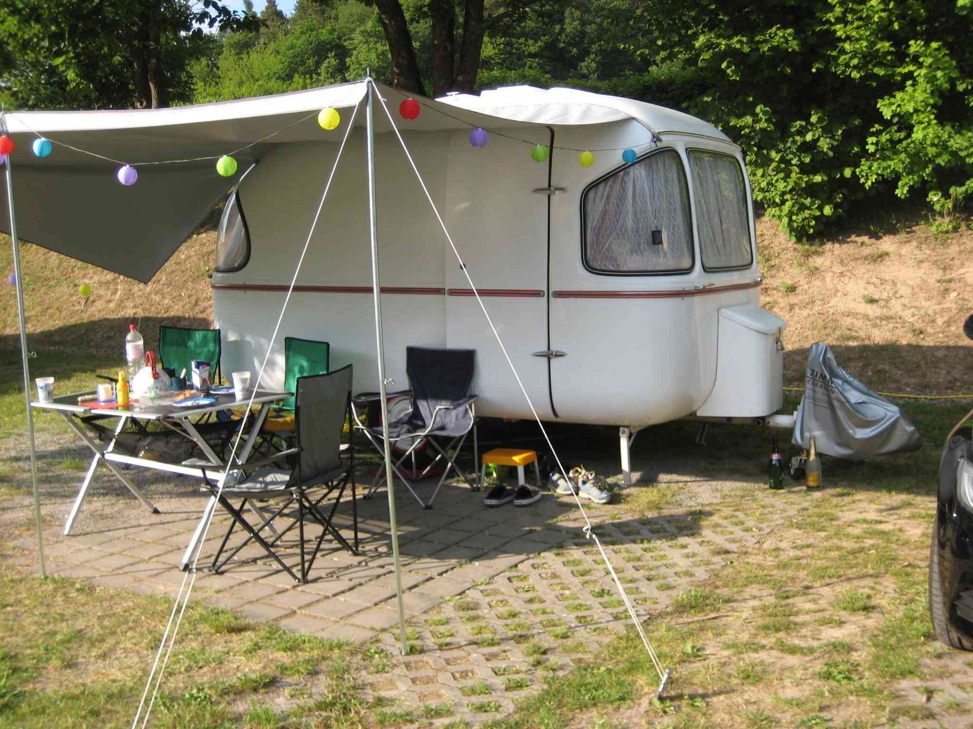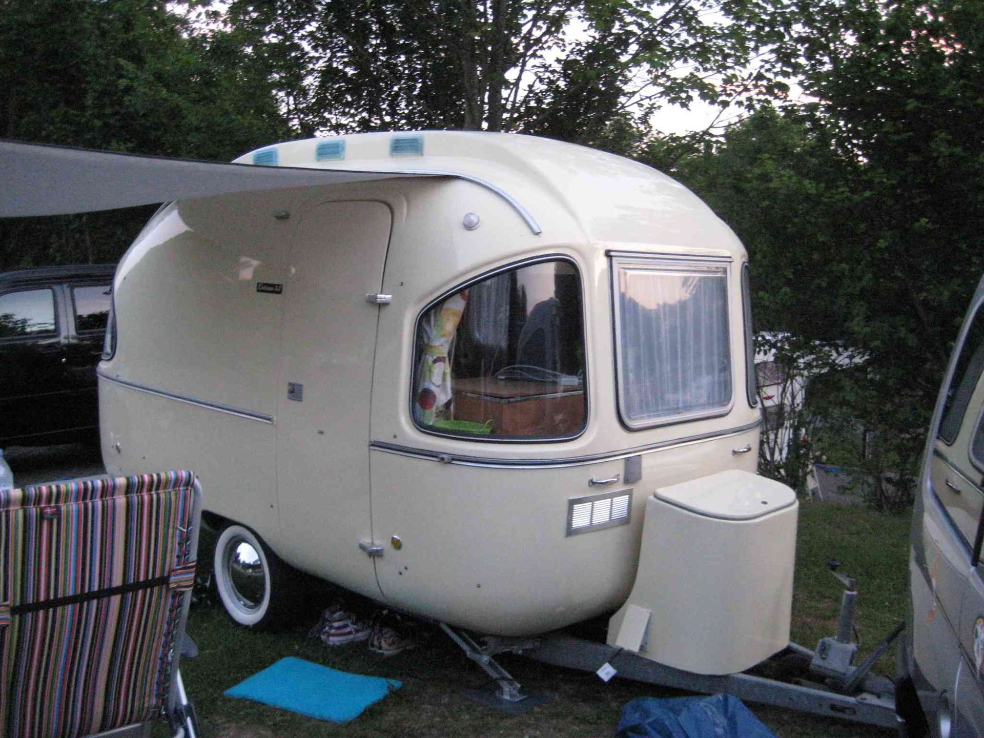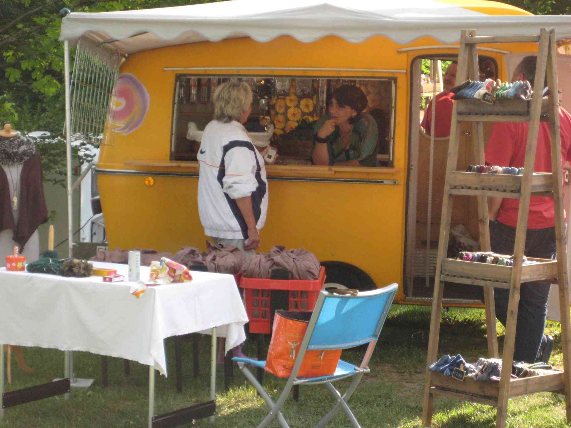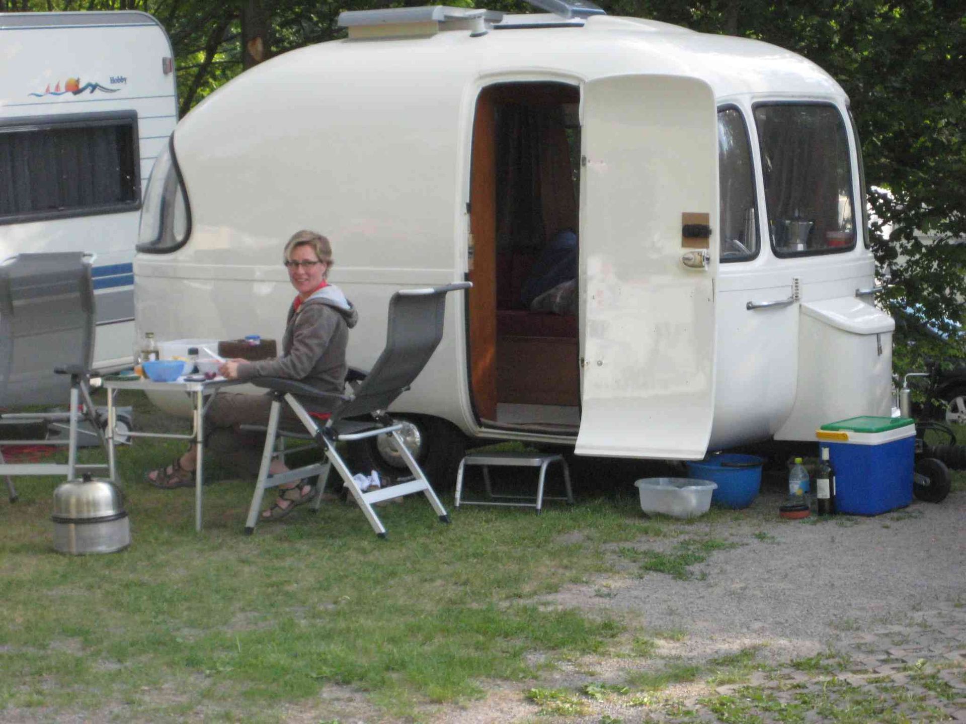 Sonntag, gemeinsame Frühstückstafel, immer noch mit Sonne! „La Socke“, der Junior 400 von Laila und Uwe, knallorange und umgebaut zum originellen Verkaufswagen, kommt auch noch zu unserem Treffen. Somit haben wir alle FAHTI-Modelle zusammen. Anschließend machen wir unserem internen „Tag der offenen Wohnwagentür“, mit Fachsimpeln und Austauschen, Ratschlägen und Verbesserungen und, und ….