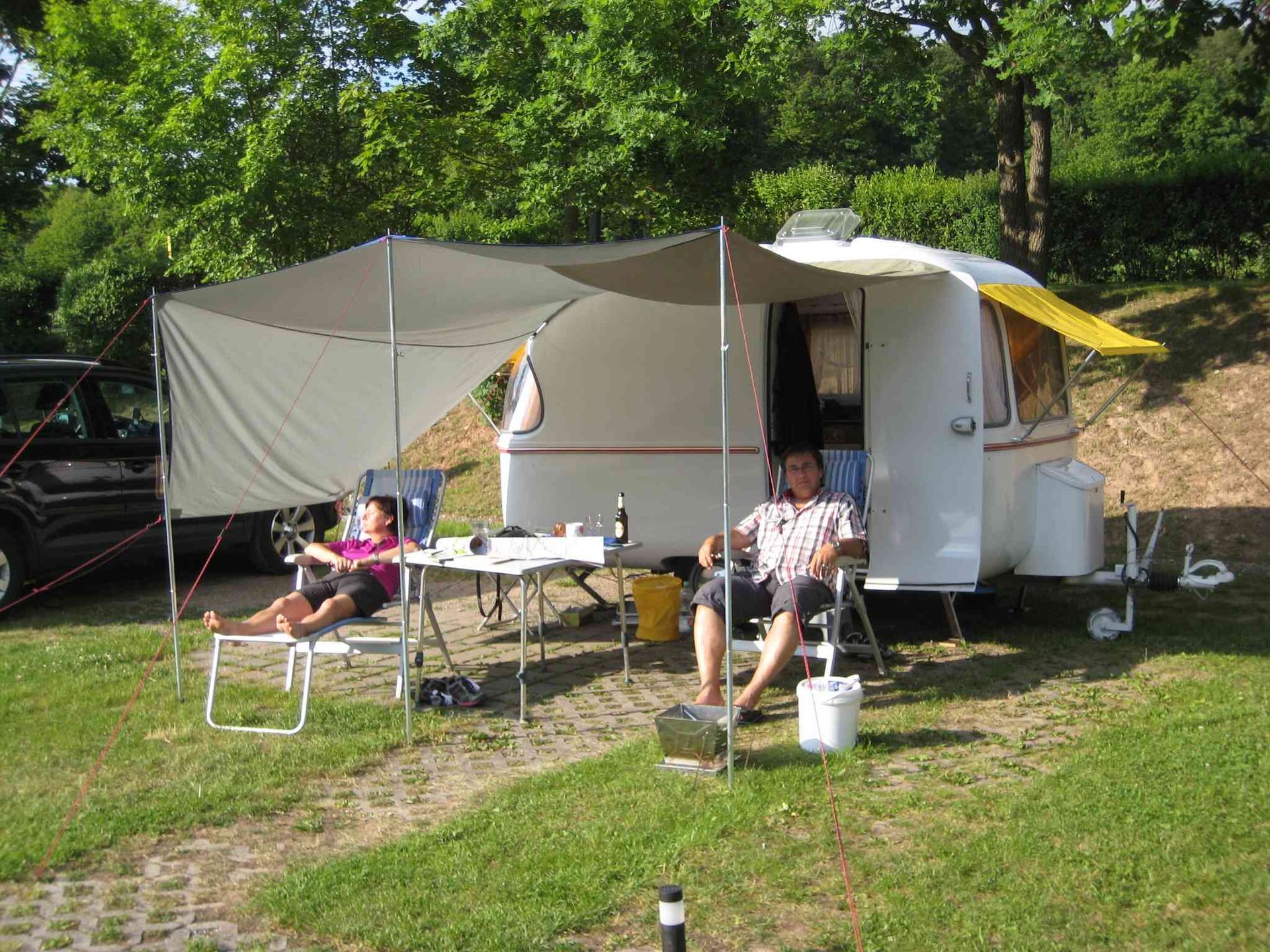 Ab Mittwoch kommen Irene und Gert mit ihrem FAHTI Super 800, gleich danach Klaas und Ineke mit einem BIOD Expert und Sir Henry mit seiner Suleika als Gast auf der Durchreise. Klaas und Ineke haben die weiteste Anreise, sie wohnen am Ijsselmeer in den Niederlanden. Am Freitag reisen auch unsere Organisatoren Anja und Jürgen mit Eric und Luis inklusive FAHTI Luxus 600 an, außerdem Stefan, Uschi und Ralf und Berbel und Albrecht mit ihren 600ern. Samstag kommen noch unsere Neulinge Esther und Reiner (600) dazu, auch Tanja und Partner (sie müssen aber leider bald wieder abreisen, da zu Hause ihr Hund gestorben war). Vielleicht klappt’s ja beim nächsten Treffen ohne Probleme!! Der Platz ist gut gefüllt, die Sonne scheint und noch immer kein einziger Regenschauer!! Aber kein Wunder, Jürgen hatte es ja auch so versprochen.