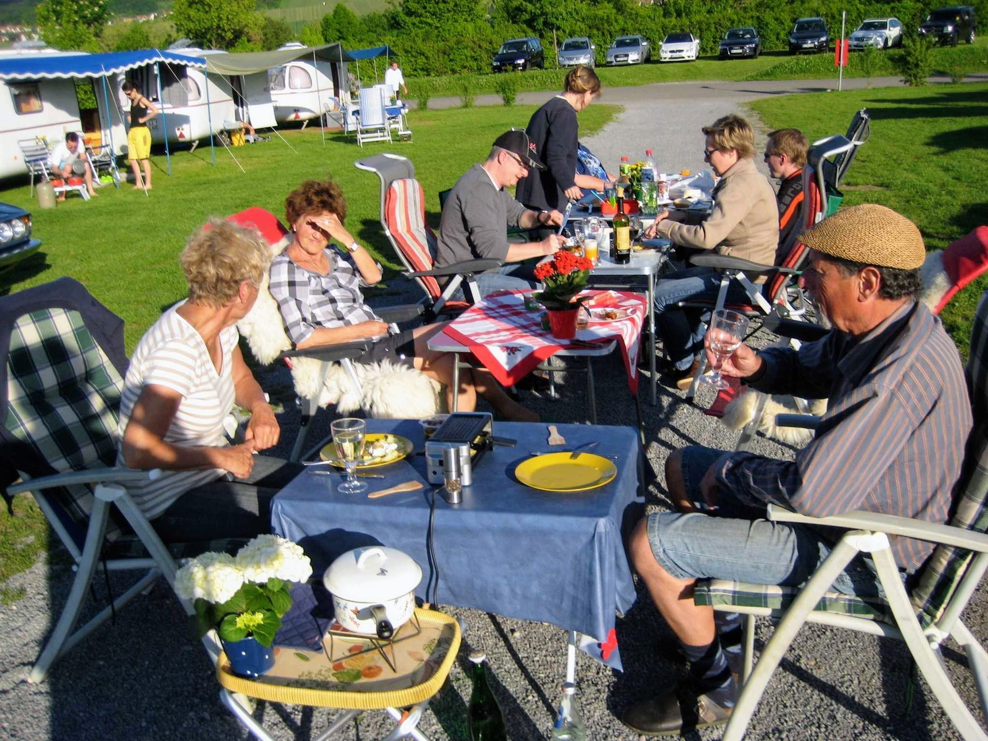 Abends ist in der langen Reihe gemeinsames Abendessen angesagt, jeder kocht, grillt oder isst Raclette (wie wir) wie er will.