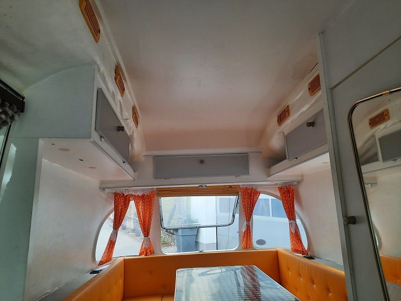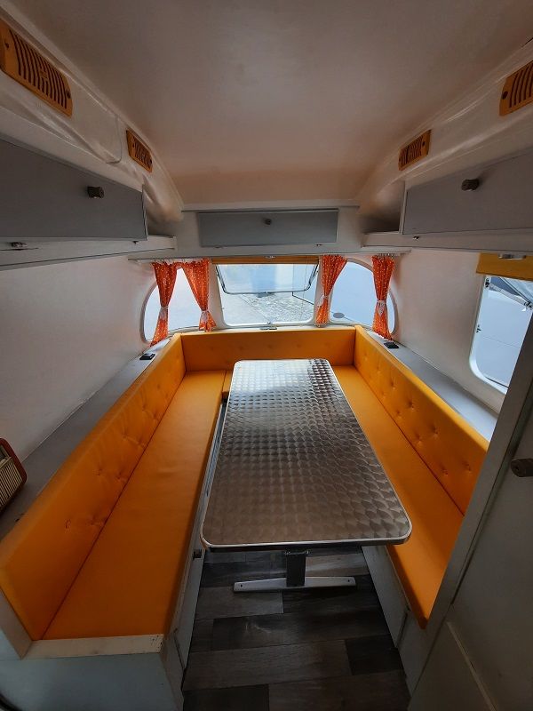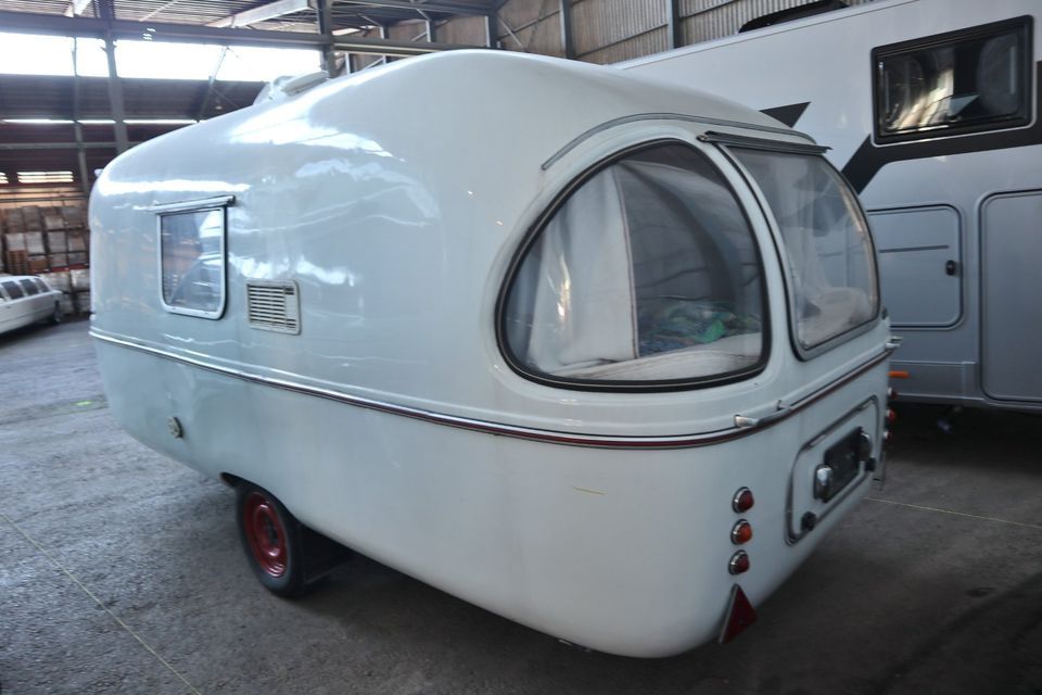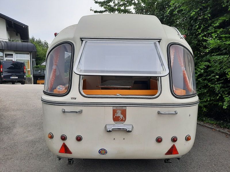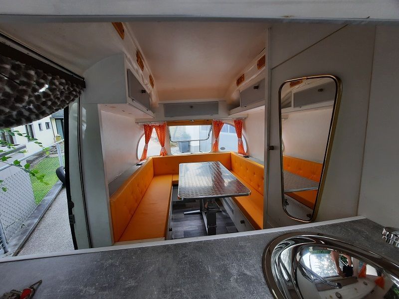 Er ist von den drei produzierten Wohnwagen der kürzeste und leichteste. Die Küche befindet sich vorne quer. Die Sitzgruppe im Heck lässt sich zum Bett umbauen.
